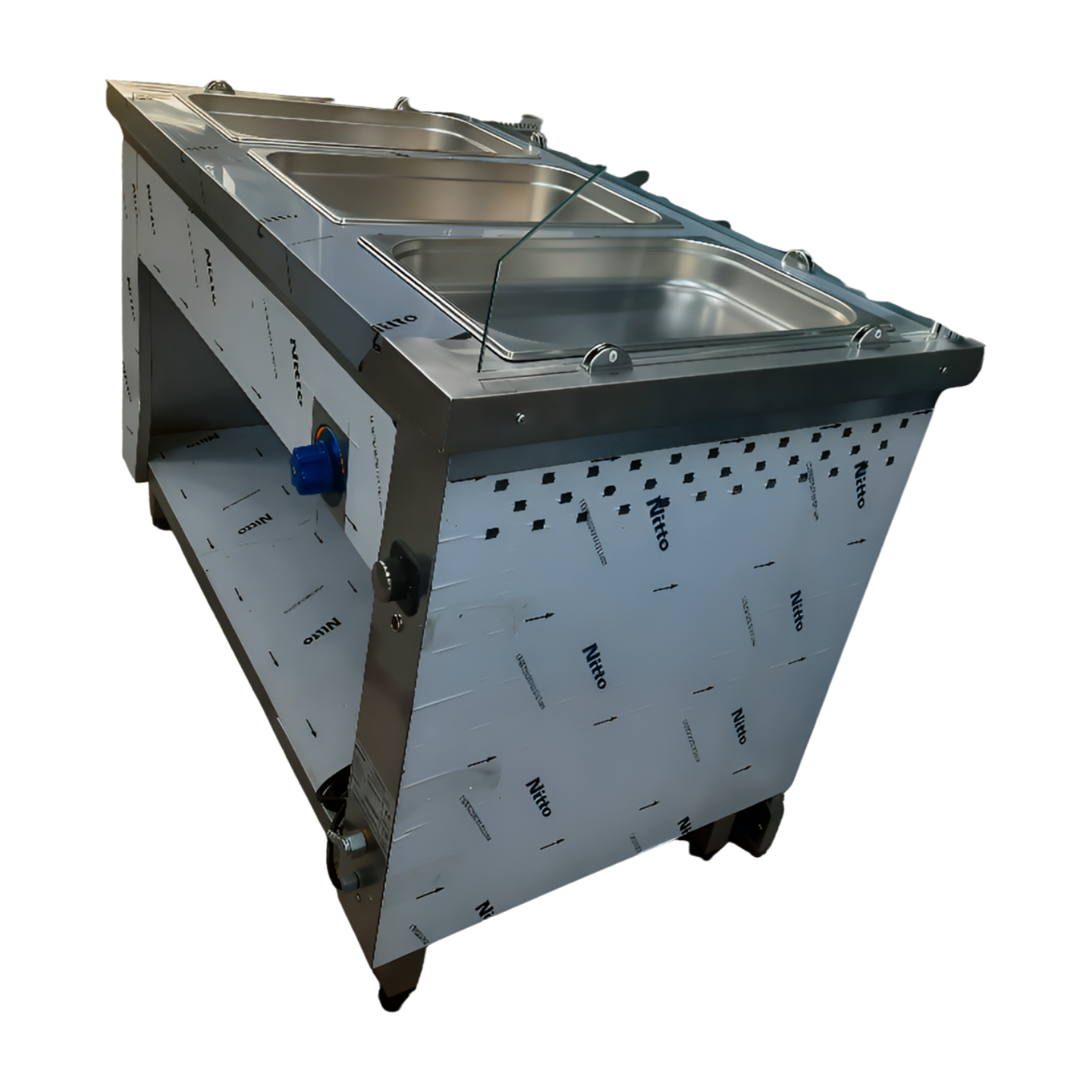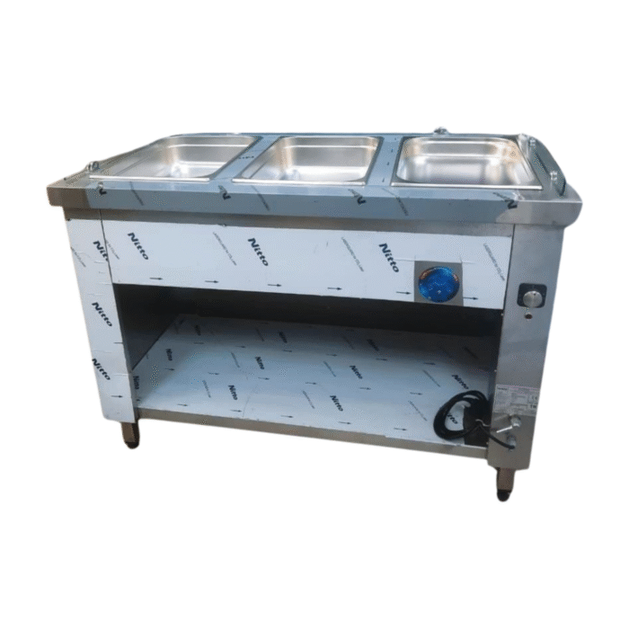 بان ماري لتسخين وحفظ الطعام، مصنوع من الفولاذ المقاوم للصدأ ويعمل بنظامي غاز وكهرباء للحفاظ على درجة حرارة الطعام بشكل متساوٍ.