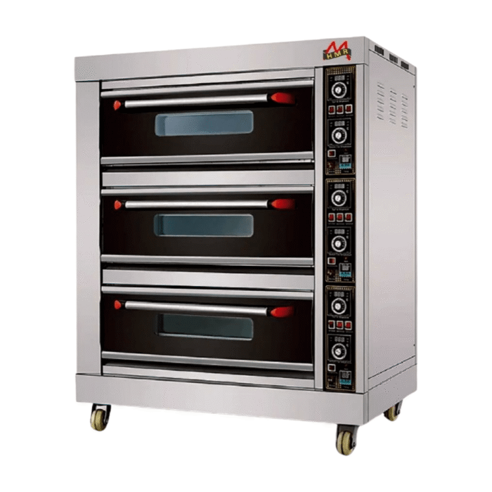 فرن حراري كهربائي احترافي من Equiper، بثلاثة طوابق وسعة 6 صواني، مصنوع من الستانلس ستيل المقاوم للصدأ، يضمن توزيع حراري متساوٍ وأداء مثالي للمخابز والمطاعم.